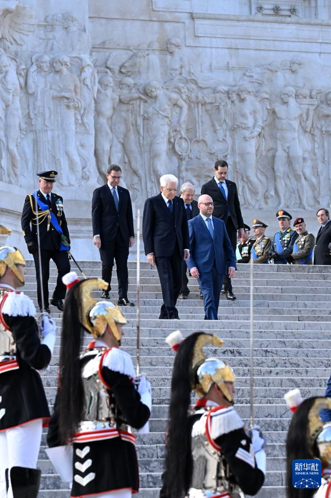 4月25日,在意大利罗马,意大利总统马塔雷拉(中)出席纪念活动。新华社发(阿尔贝托·林格利亚摄)