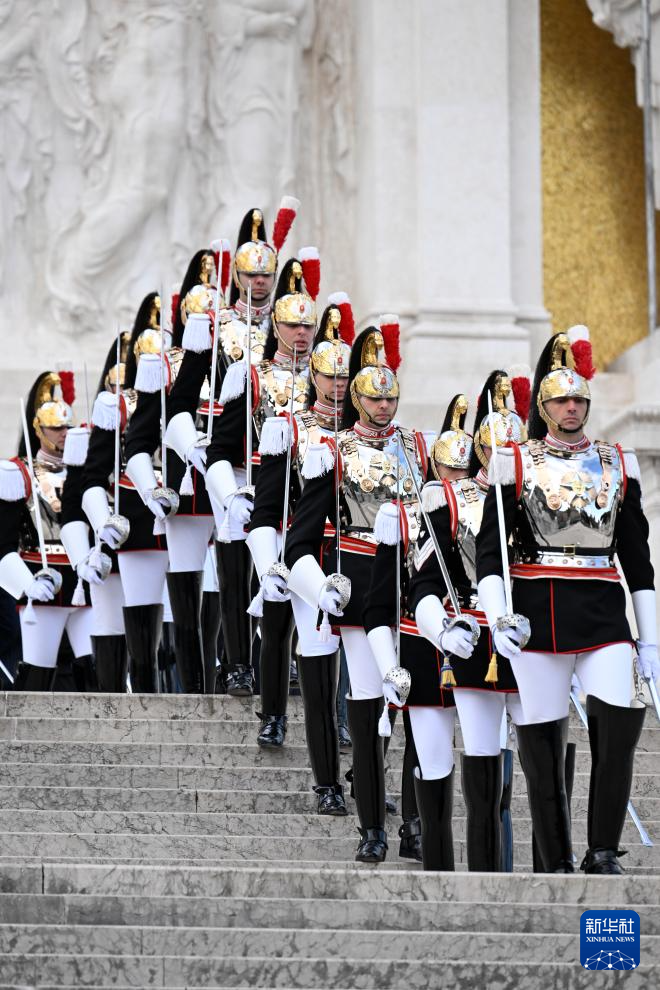 4月25日,在意大利罗马,总统卫队士兵在纪念活动上列队。新华社发(阿尔贝托·林格利亚摄)