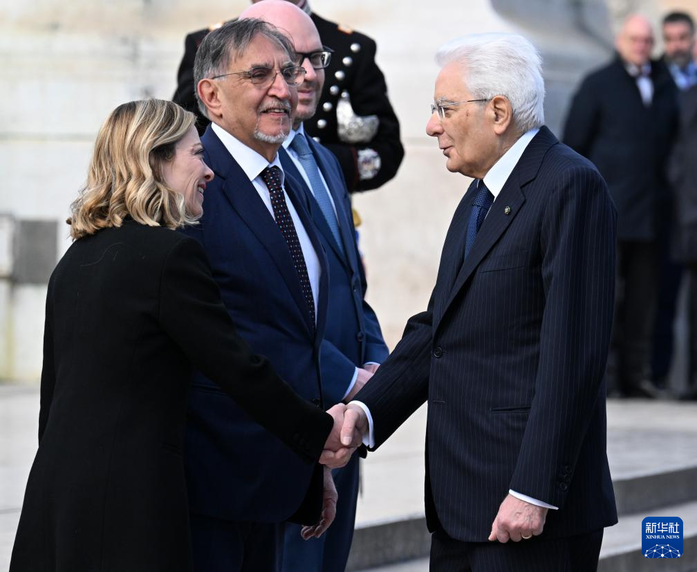 4月25日,在意大利罗马,意大利总统马塔雷拉(前右)与总理梅洛尼(前左)出席纪念活动时握手。新华社发(阿尔贝托·林格利亚摄)