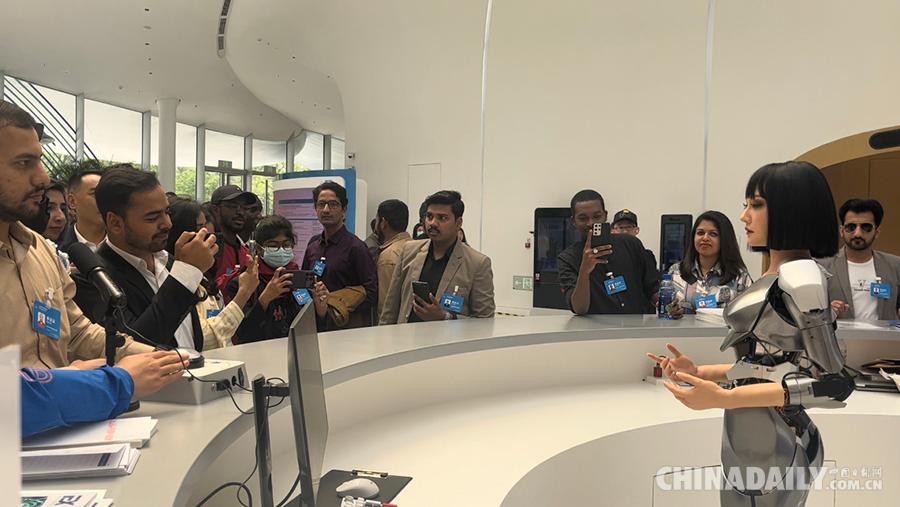 中关村国际创新中心内的人形仿生机器人正在回答观众的提问。