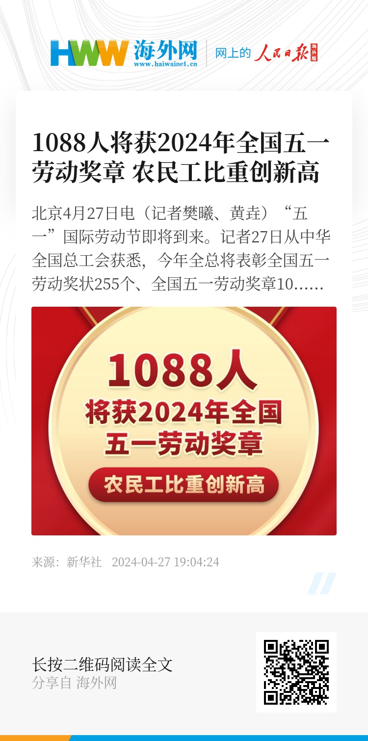 新华社北京4月27日电(记者樊曦、黄垚)“五一”国际劳动节即将到来。记者27日从中华全国总工会获悉,今年全总将表彰全国五一劳动奖状255个、全国五一劳动奖章1088个、全国工人先锋号1034个。其中,常规奖章表彰对象中有农民工172人,占18.2%,比重再创新高。