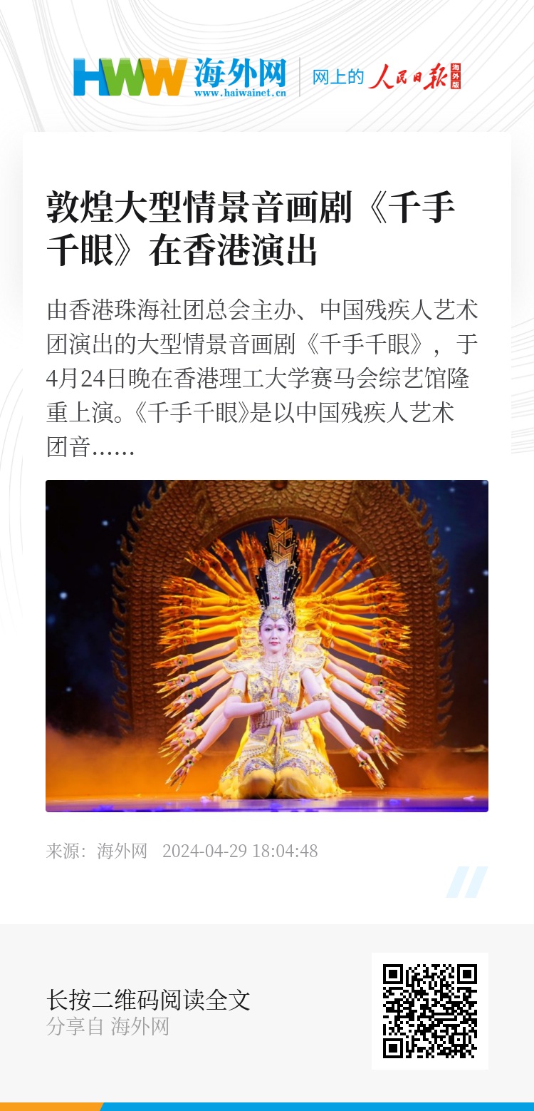 由香港珠海社团总会主办、中国残疾人艺术团演出的大型情景音画剧《千手千眼》,于4月24日晚在香港理工大学赛马会综艺馆隆重上演。