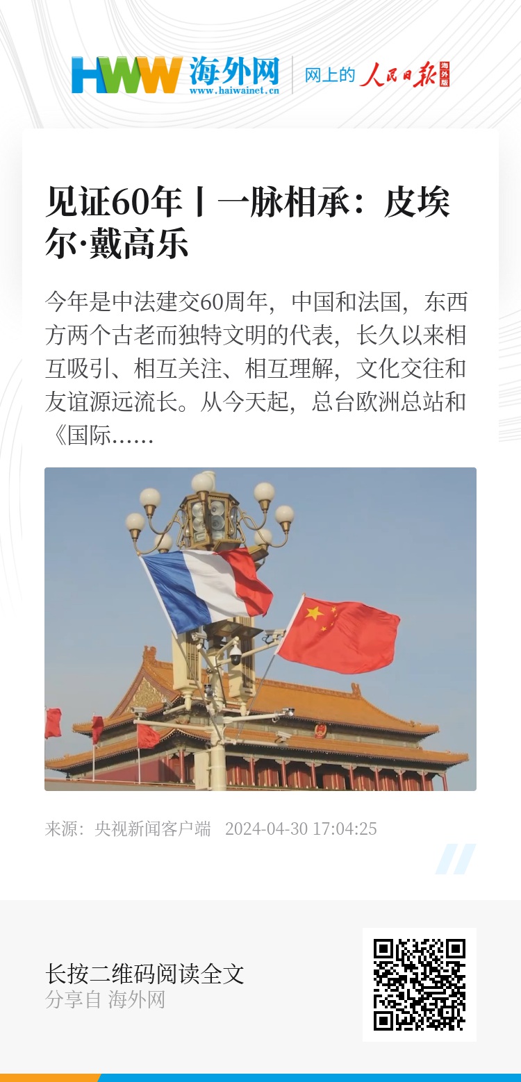 60年前,在时任法国总统戴高乐将军的领导下,法国成为第一个同新中国建立大使级外交关系的西方大国。如今,戴高乐将军的孙子皮埃尔·戴高乐延续了他祖父的主张,继续积极主张世界多极化,支持通过多边协调携手应对全球性挑战。