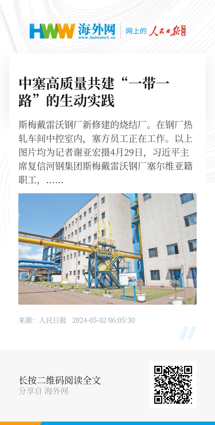 “斯梅戴雷沃钢厂起死回生是个成功的典范。它有力地证明‘一带一路’倡议给塞尔维亚带来的是就业的增加和经济的增长。”塞尔维亚总统武契奇表示。