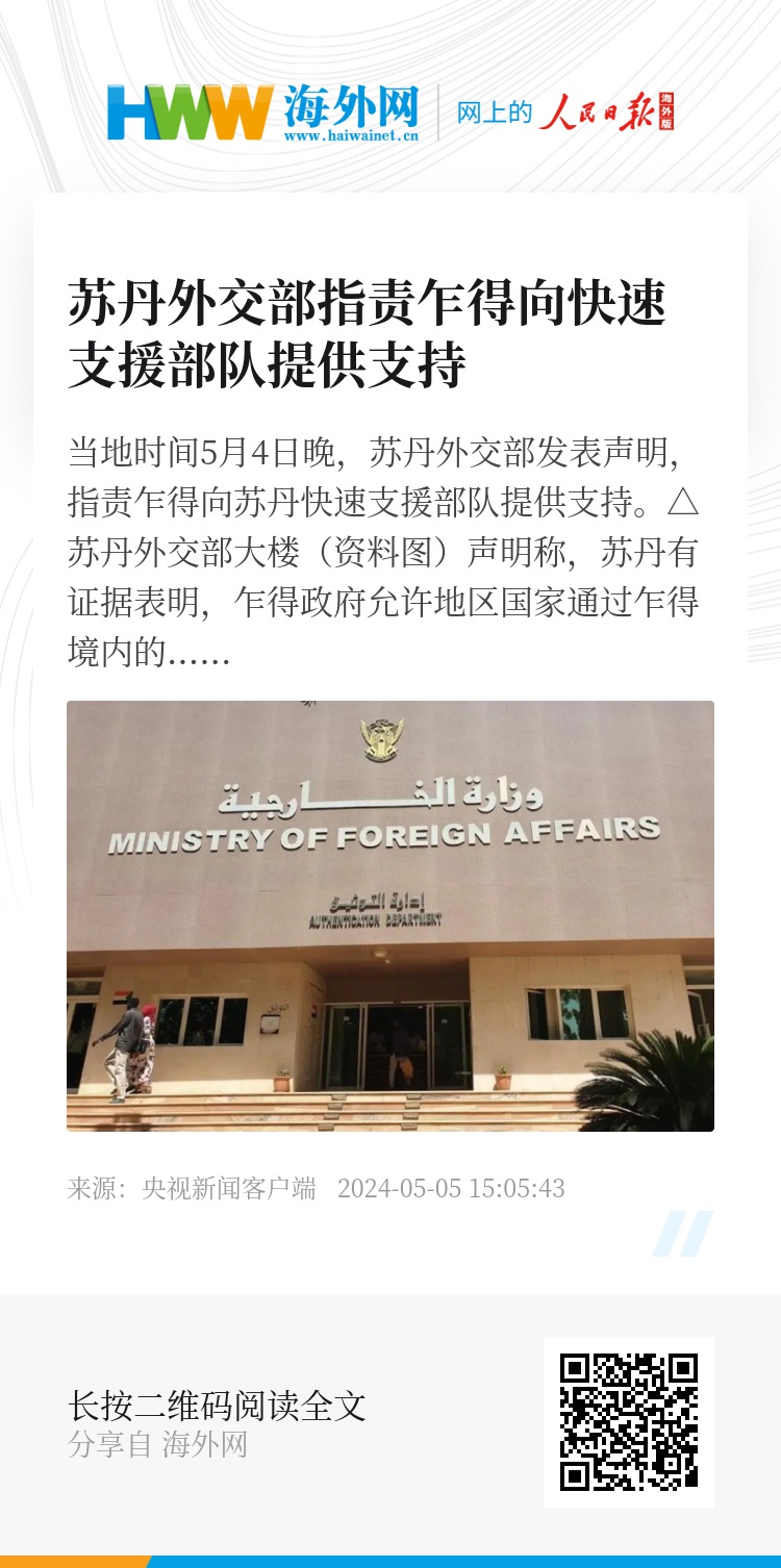 当地时间5月4日晚,苏丹外交部发表声明,指责乍得向苏丹快速支援部队提供支持。