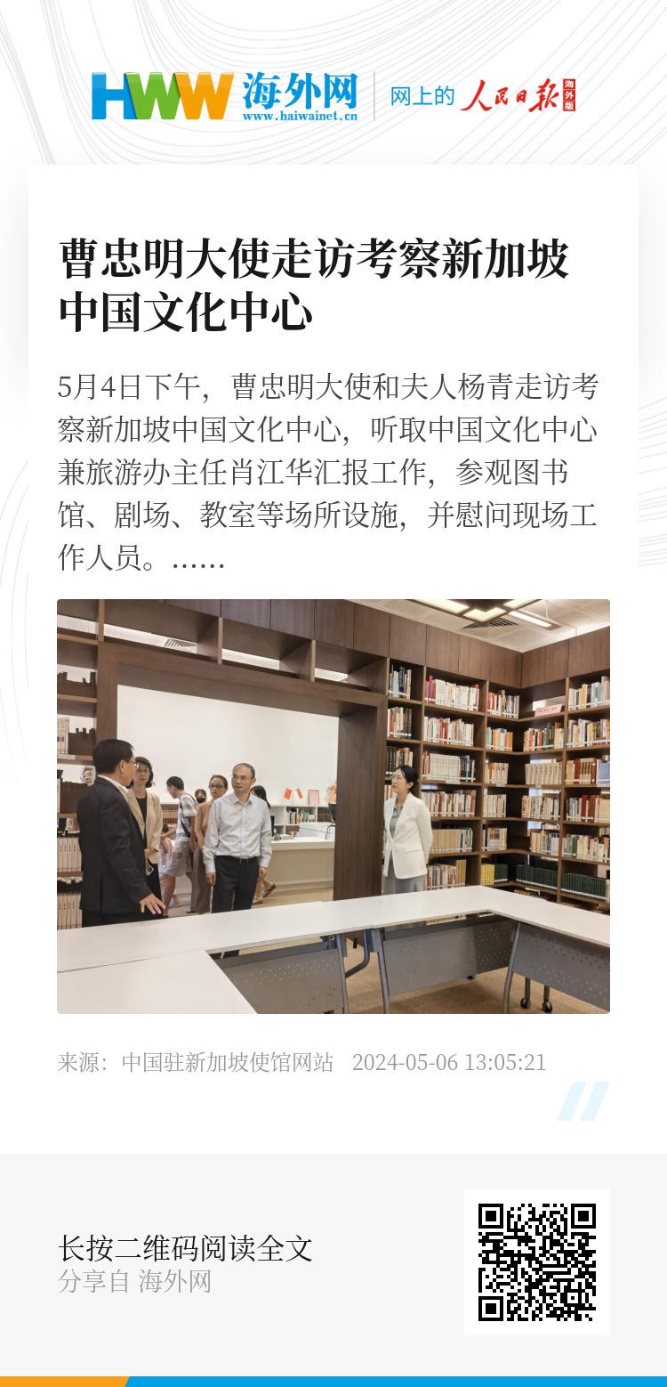 5月4日下午,曹忠明大使和夫人杨青走访考察新加坡中国文化中心,听取中国文化中心兼旅游办主任肖江华汇报工作,参观图书馆、剧场、教室等场所设施,并慰问现场工作人员。
