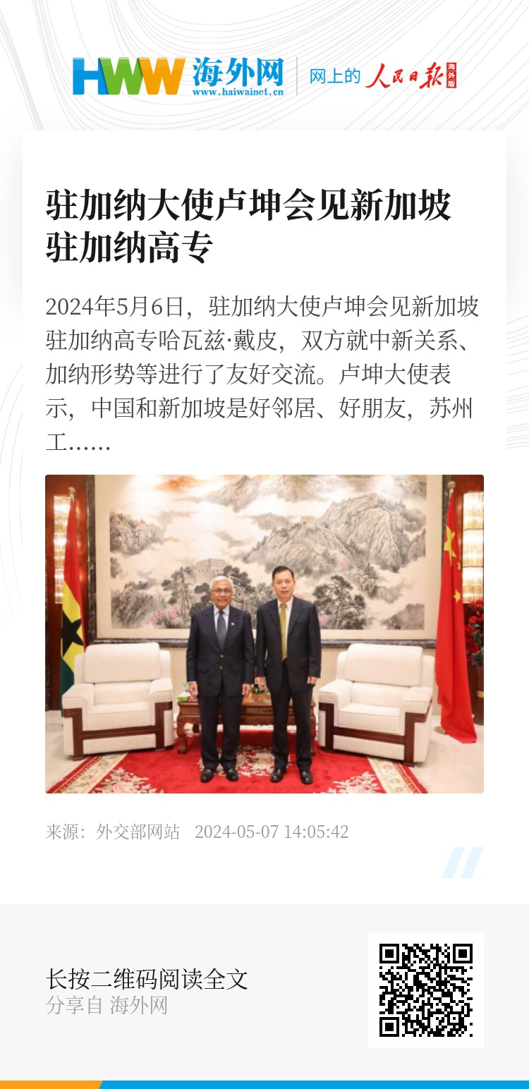 2024年5月6日,驻加纳大使卢坤会见新加坡驻加纳高专哈瓦兹·戴皮,双方就中新关系、加纳形势等进行了友好交流。
