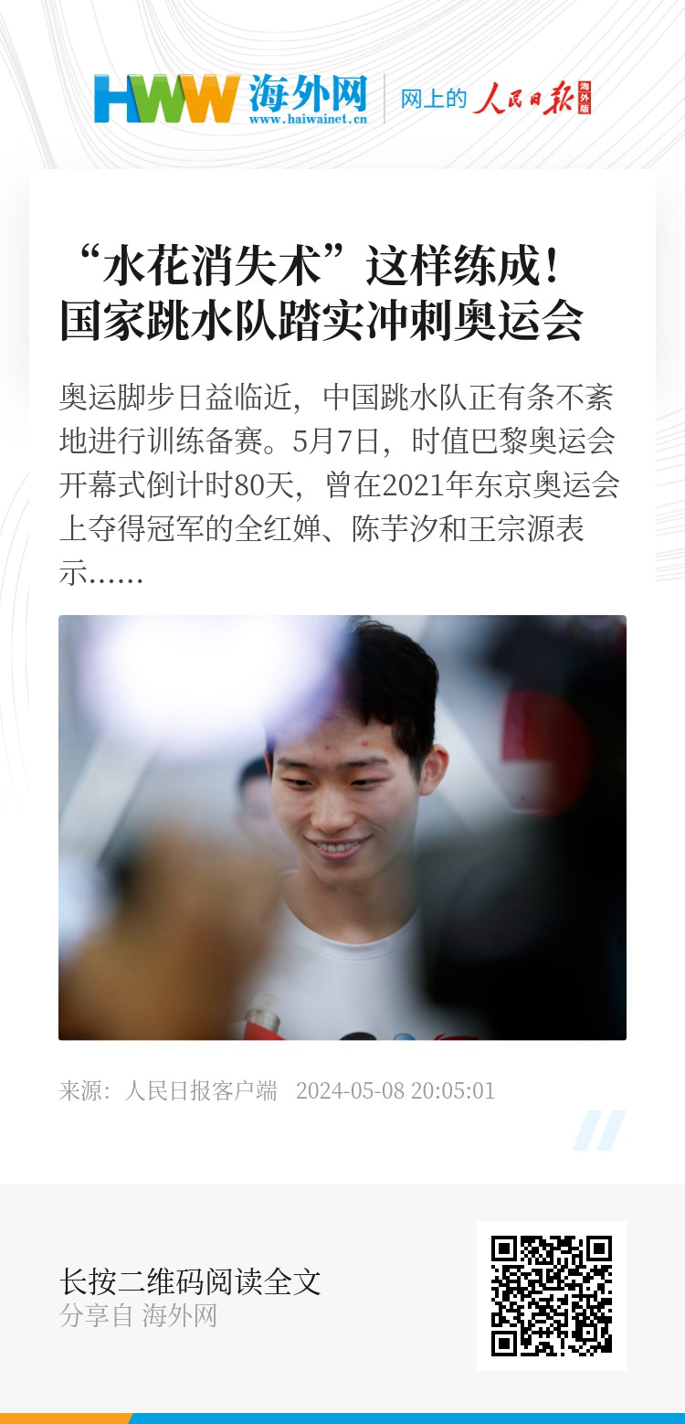 目前,中国跳水队在北京调整训练,为巴黎奥运会进行最后的冲刺。22岁的王宗源在东京奥运会上和谢思埸搭档获得男子双人三米板冠军,并摘得男子三米板银牌,此后在国际比赛中保持不俗成绩。5月7日,王宗源在上午练体能和跑步,下午进行水上训练。他表示,自己近期正处于恢复体能和打磨技术动作阶段,每天都严格执行教练的训练计划。