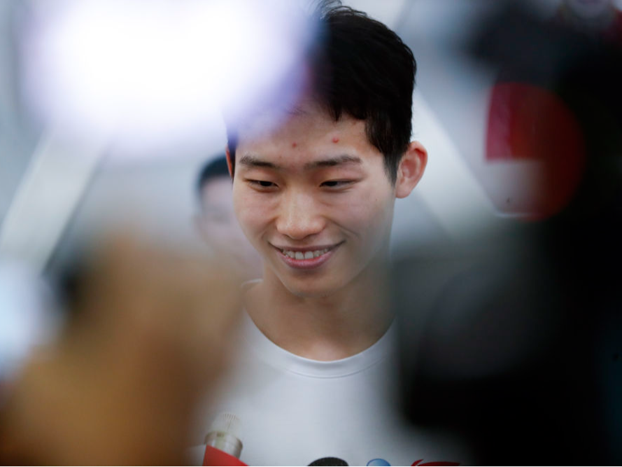 5月7日,中国跳水队队员王宗源在训练后接受采访。新华社记者 雒圆 摄