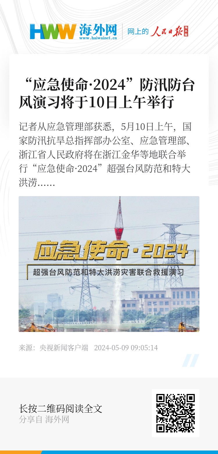 记者从应急管理部获悉,5月10日上午,国家防汛抗旱总指挥部办公室、应急管理部、浙江省人民政府将在浙江金华等地联合举行“应急使命·2024”超强台风防范和特大洪涝灾害联合救援演习。