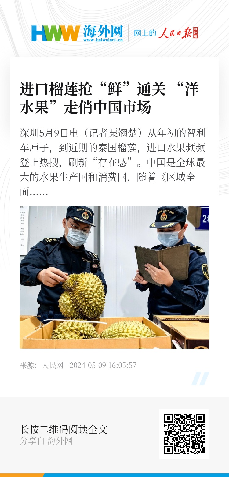 人民网深圳5月9日电(记者栗翘楚)从年初的智利车厘子,到近期的泰国榴莲,进口水果频频登上热搜,刷新“存在感”。中国是全球最大的水果生产国和消费国,随着《区域全面经济伙伴关系协定》(RCEP)深入实施,低关税、快速检验检疫等政策出台,越来越多进口水果进入中国市场,让中国家庭的“果盘”不断丰富,满足消费者多元需求。