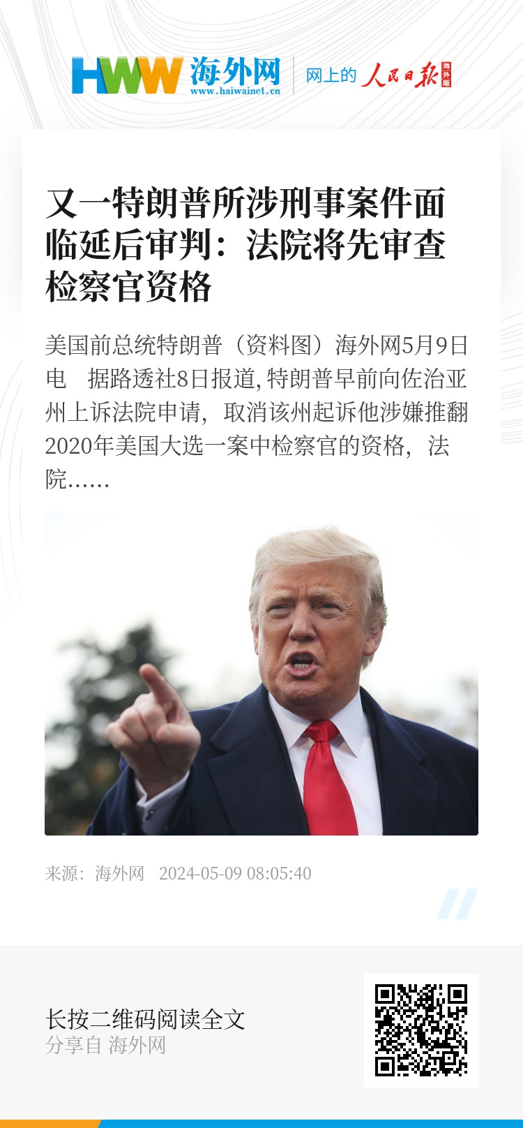 海外网5月9日电 据路透社8日报道,特朗普早前向佐治亚州上诉法院申请,取消该州起诉他涉嫌推翻2020年美国大选一案中检察官的资格,法院近期同意将对检察官资格进行审查。