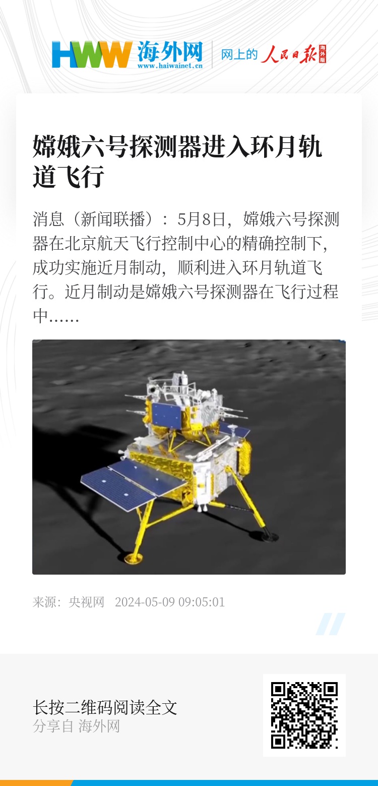 央视网消息(新闻联播):5月8日,嫦娥六号探测器在北京航天飞行控制中心的精确控制下,成功实施近月制动,顺利进入环月轨道飞行。