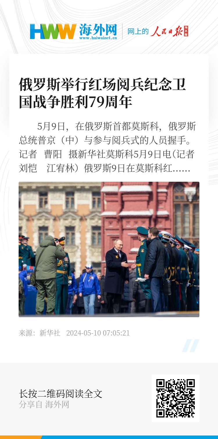 新华社莫斯科5月9日电(记者刘恺 江宥林)俄罗斯9日在莫斯科红场举行阅兵式,纪念卫国战争胜利79周年。俄国防部长绍伊古和俄联邦武装力量陆军总司令萨柳科夫乘车检阅各方队。俄总统兼武装力量最高统帅普京出席并致辞。