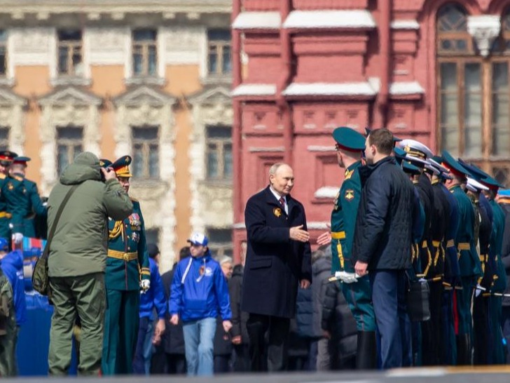 5月9日,在俄罗斯首都莫斯科,俄罗斯总统普京(中)与参与阅兵式的人员握手。新华社记者 曹阳 摄