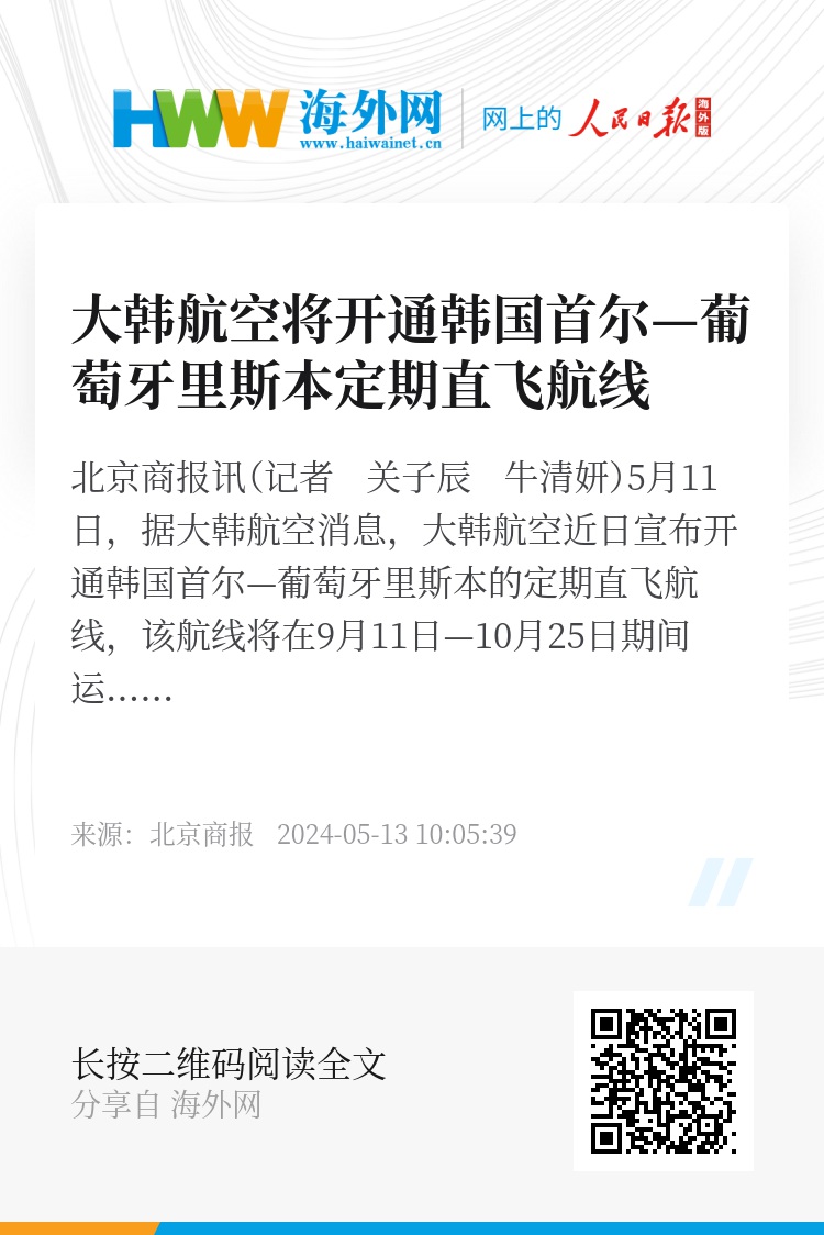 北京商报讯(记者 关子辰 牛清妍)5月11日,据大韩航空消息,大韩航空近日宣布开通韩国首尔—葡萄牙里斯本的定期直飞航线,该航线将在9月11日—10月25日期间运营。