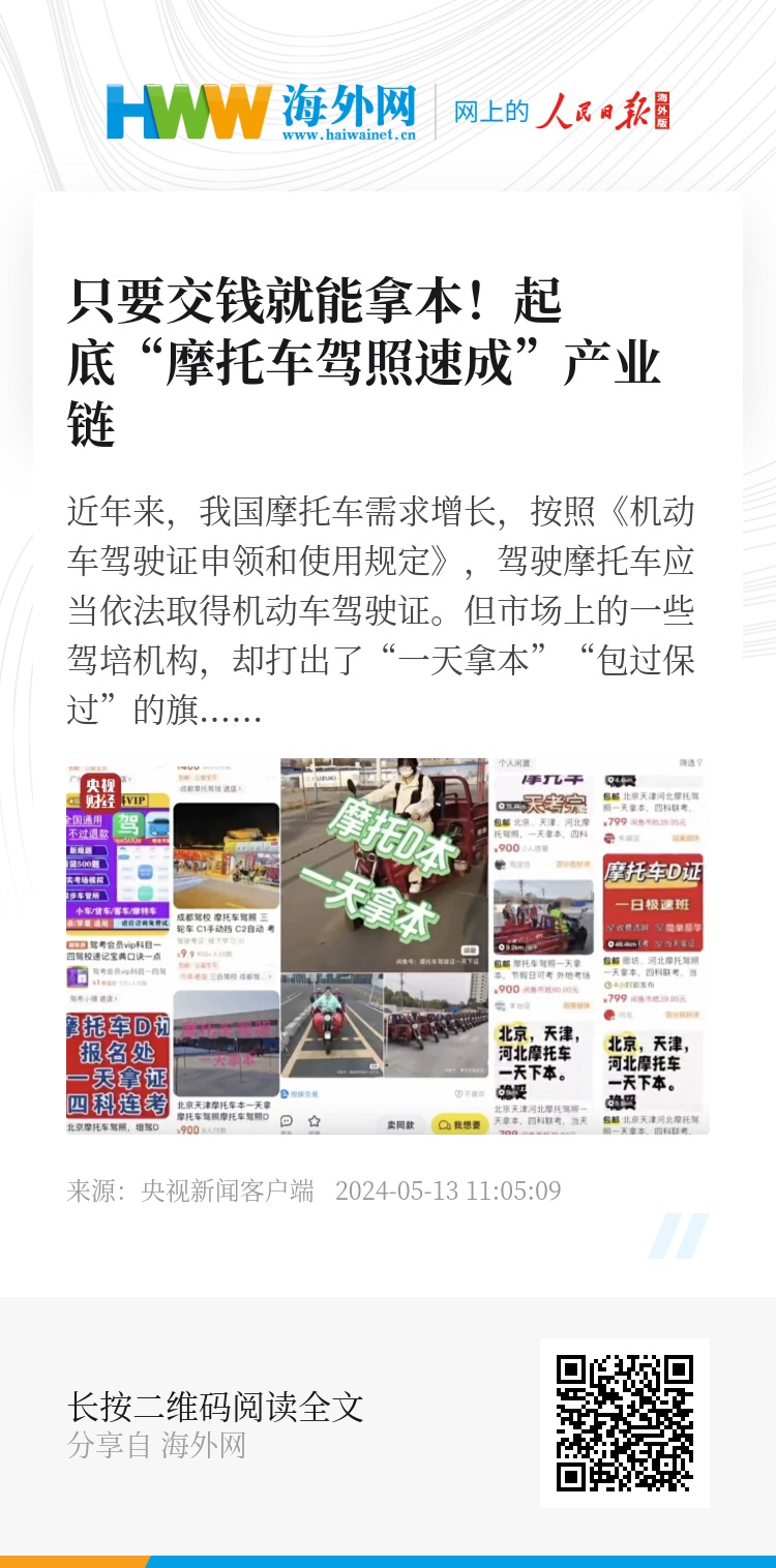 总台《财经调查》栏目揭开“摩托车驾照速成班”作弊产业链黑幕。
