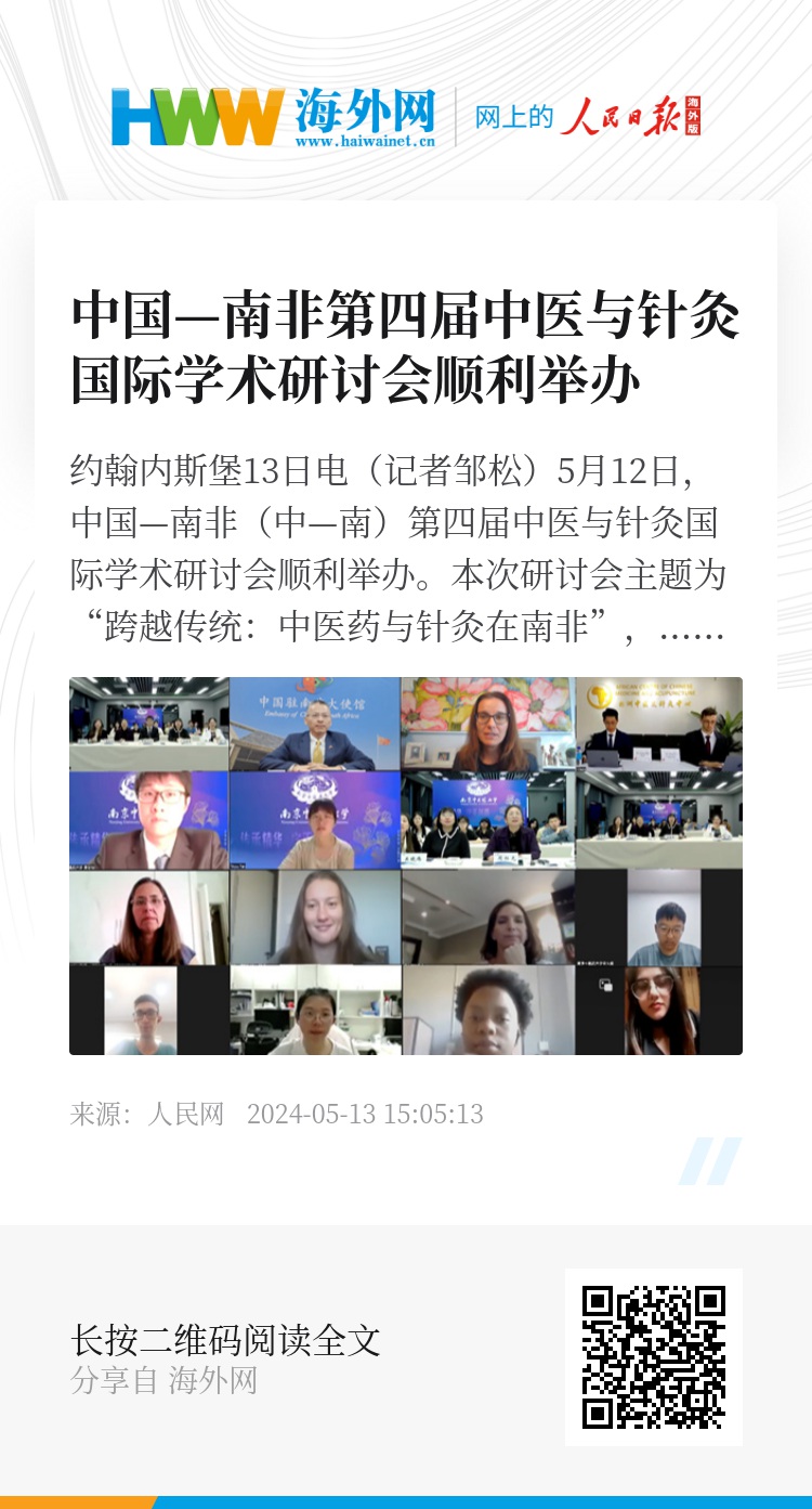 人民网约翰内斯堡13日电(记者邹松)5月12日,中国—南非(中—南)第四届中医与针灸国际学术研讨会顺利举办。本次研讨会主题为 “跨越传统:中医药与针灸在南非”,由南京中医药大学、约翰内斯堡大学针灸临床基地、非洲中医及针灸学会共同举办,旨在加强中-南在传统医药教育、科研创新和医疗服务等方面的合作,中国驻南非大使馆教育参赞李旭东、南京中医药大学副校长胡立宏、南非卫生部南非联合健康署财务委员会主席瑞德米拉·瑞兹洛格,非洲中医及针灸学会会长胡紫景,以及来自中国、南非、中国香港、美国、加拿大等国家和地区200余名专家及医师参加此次会议,研讨会采用线上与线下结合的模式,设立南京中医大学及非洲中医及针灸中心两个分会场。