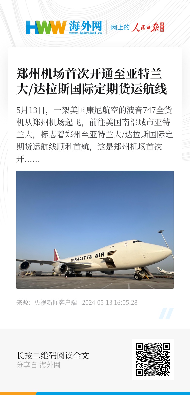 5月13日,一架美国康尼航空的波音747全货机从郑州机场起飞,前往美国南部城市亚特兰大,标志着郑州至亚特兰大/达拉斯国际定期货运航线顺利首航,这是郑州机场首次开通直飞亚特兰大/达拉斯的货运航线,进一步完善了郑州机场航线网络布局,扩大郑州国际货运航空枢纽辐射范围。
