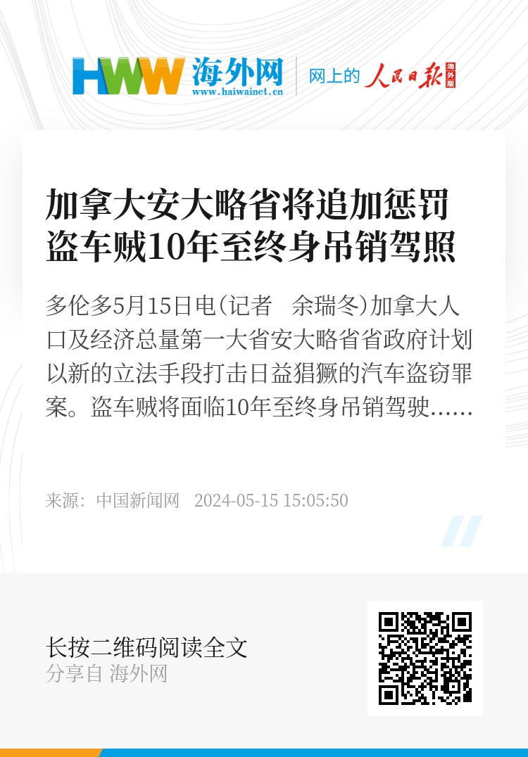 中新网多伦多5月15日电(记者 余瑞冬)加拿大人口及经济总量第一大省安大略省省政府计划以新的立法手段打击日益猖獗的汽车盗窃罪案。盗车贼将面临10年至终身吊销驾驶执照的惩罚。