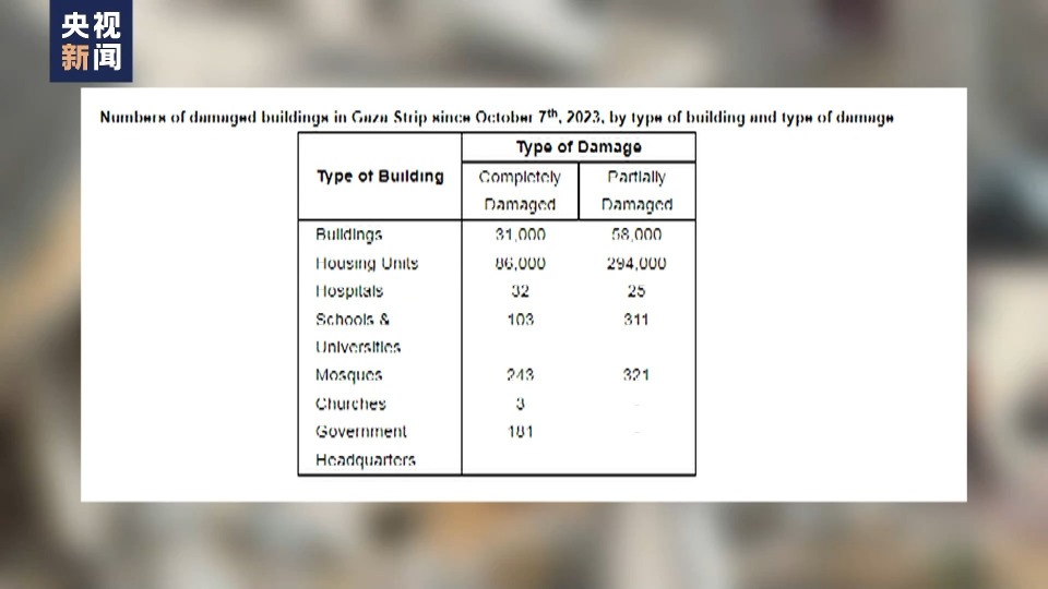 报告称, 在新一轮巴以冲突中,加沙地带有8.9万栋住宅楼、近30万个住房单元遭到损毁。冲突还摧毁了学校、医院、清真寺、政府办公楼,以及大片农业区和大量水电管线等基础设施。