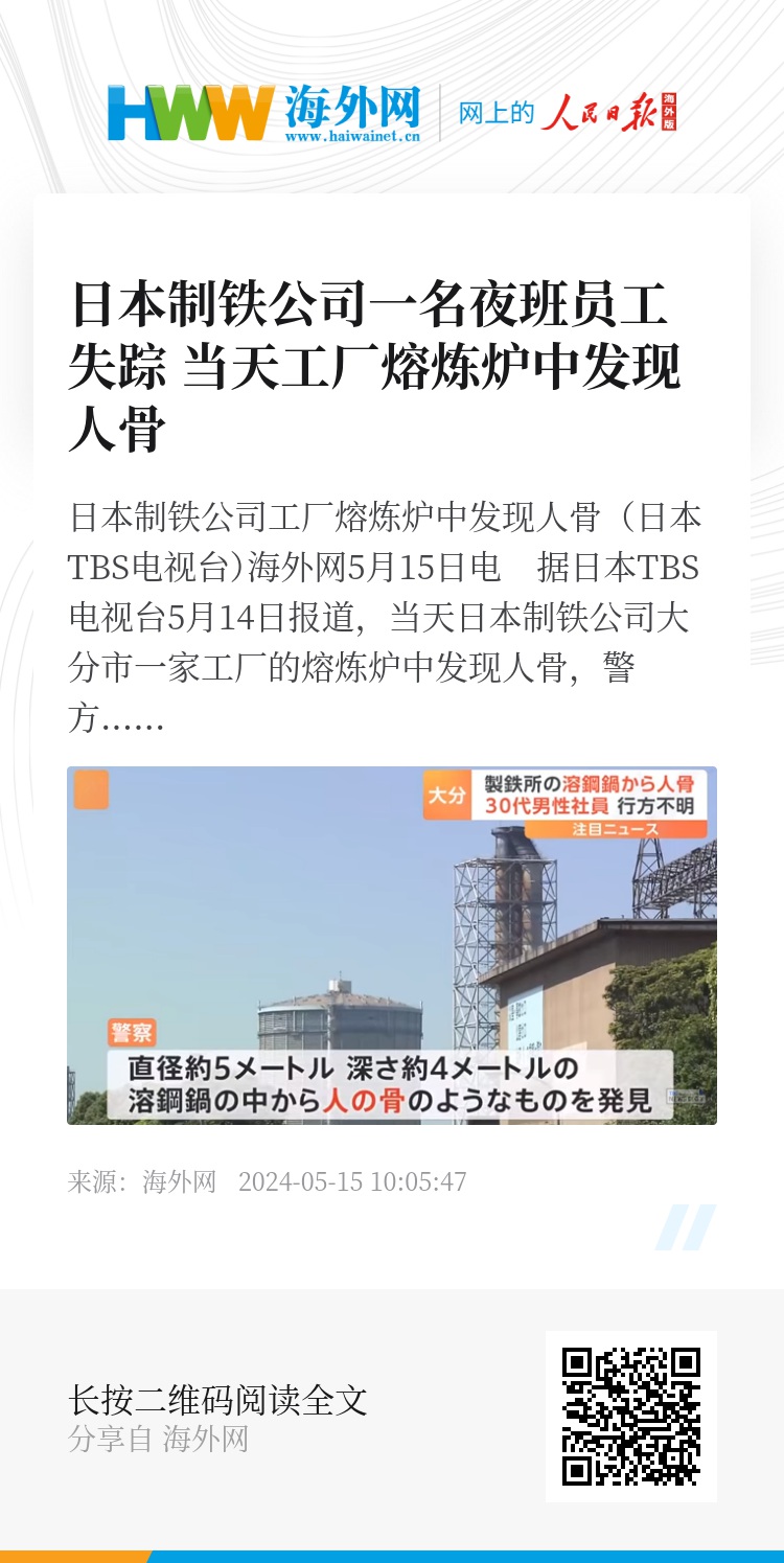 海外网5月15日电 据日本TBS电视台5月14日报道,当天日本制铁公司大分市一家工厂的熔炼炉中发现人骨,警方称其或为该工厂失踪员工的遗骨。