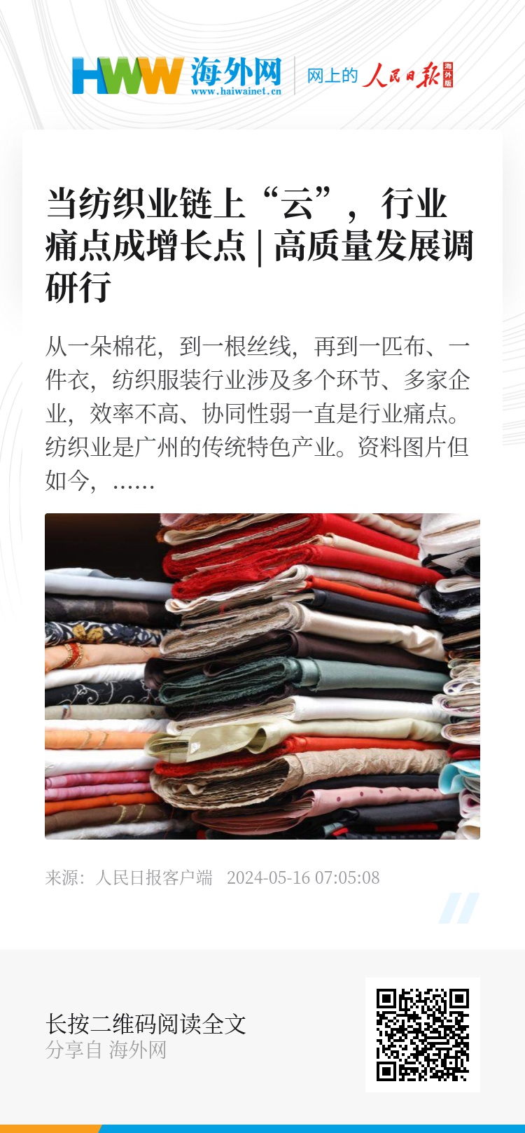 从一朵棉花,到一根丝线,再到一匹布、一件衣,纺织服装行业涉及多个环节、多家企业,效率不高、协同性弱一直是行业痛点。