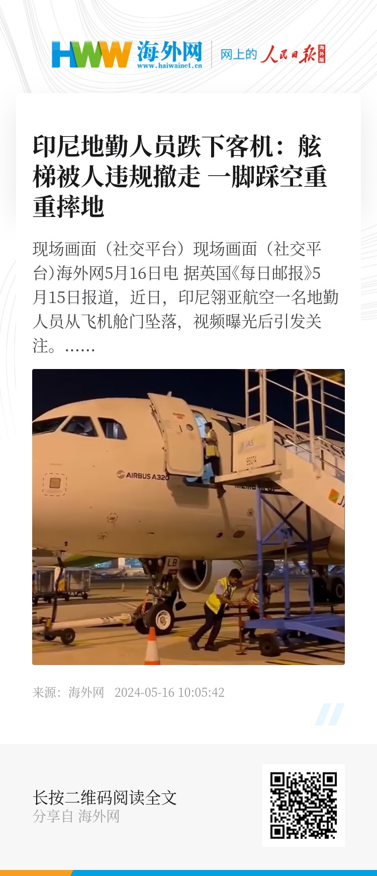 海外网5月16日电 据英国《每日邮报》5月15日报道,近日,印尼翎亚航空一名地勤人员从飞机舱门坠落,视频曝光后引发关注。