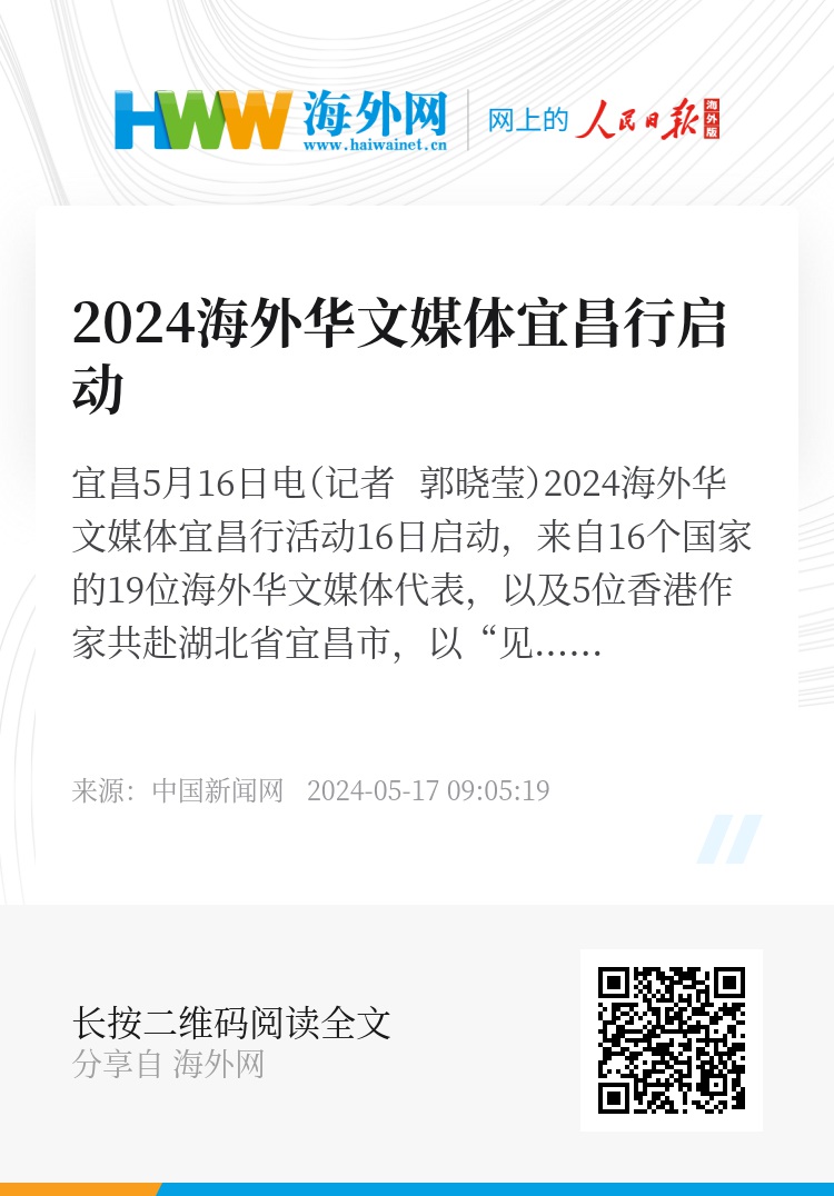 中新网宜昌5月16日电(记者 郭晓莹)2024海外华文媒体宜昌行活动16日启动,来自16个国家的19位海外华文媒体代表,以及5位香港作家共赴湖北省宜昌市,以“见证者”和“记录者”的视角,生动讲述宜昌山水人文和城市蝶变的故事。