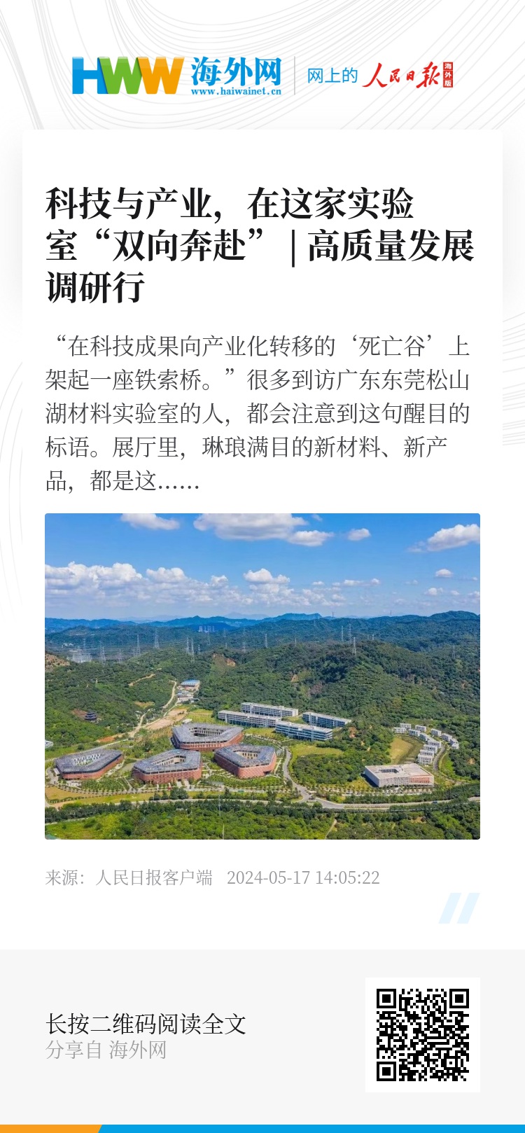 “在科技成果向产业化转移的‘死亡谷’上架起一座铁索桥。”很多到访广东东莞松山湖材料实验室的人,都会注意到这句醒目的标语。展厅里,琳琅满目的新材料、新产品,都是这句标语的注脚。