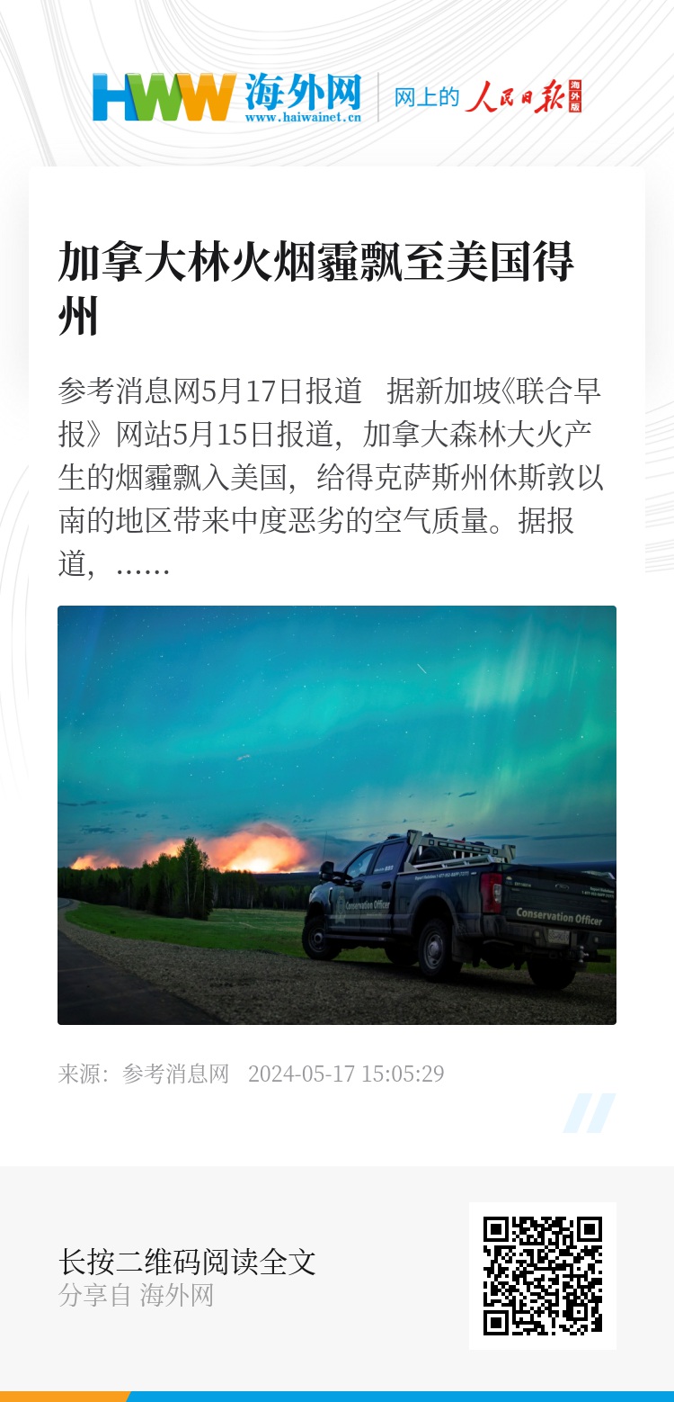 参考消息网5月17日报道 据新加坡《联合早报》网站5月15日报道,加拿大森林大火产生的烟霾飘入美国,给得克萨斯州休斯敦以南的地区带来中度恶劣的空气质量。
