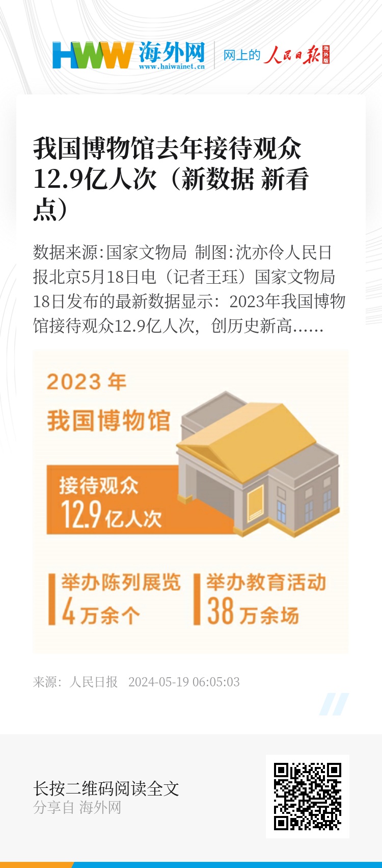 人民日报北京5月18日电(记者王珏)国家文物局18日发布的最新数据显示:2023年我国博物馆接待观众12.9亿人次,创历史新高;2023年全年新增备案博物馆268家,全国备案博物馆达6833家。今年“五一”假期,我国博物馆接待观众超过5000万人次,“博物馆热”持续升温。
