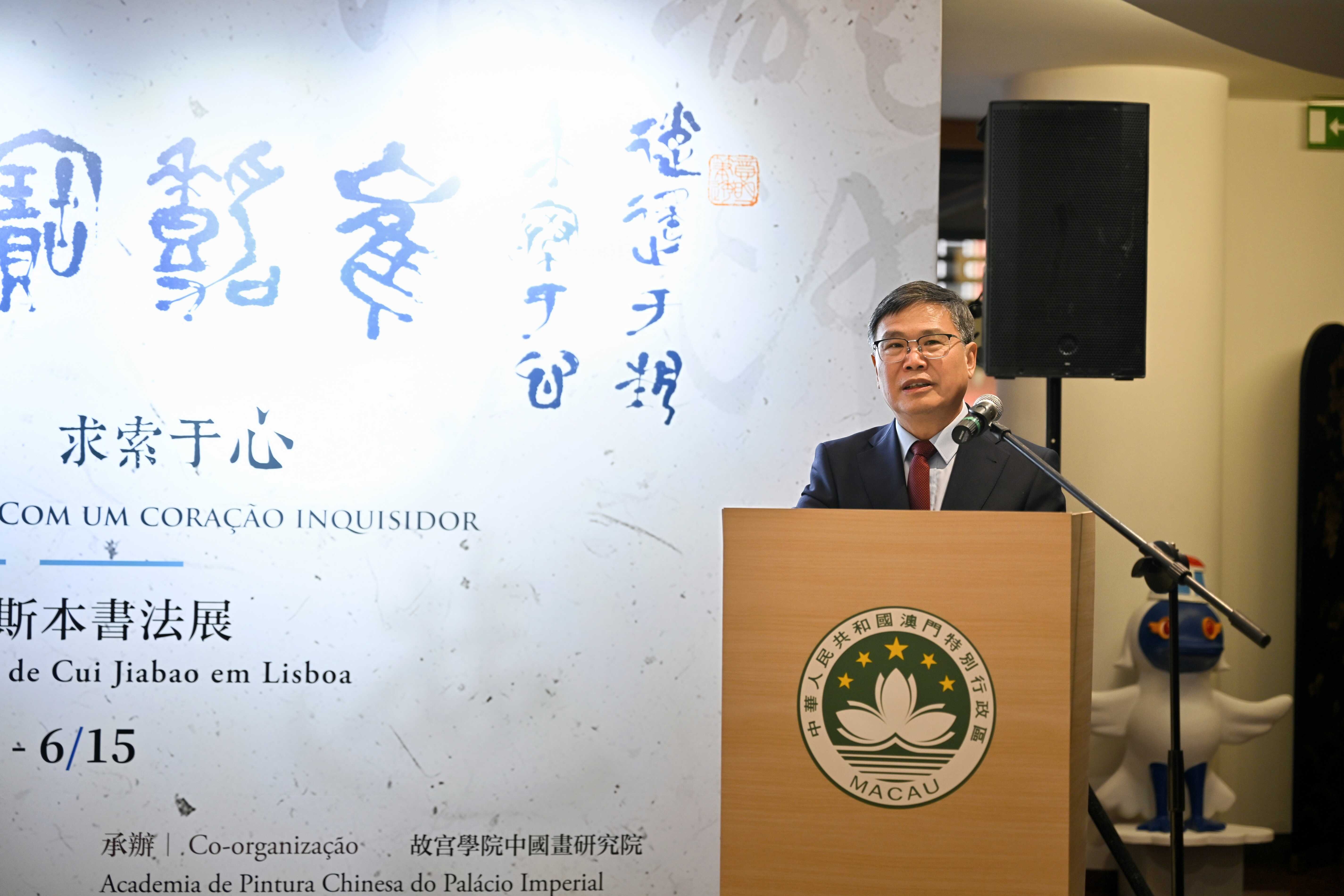 5月15日,驻葡萄牙大使赵本堂出席由澳门驻里斯本经济贸易办事处举办的庆祝澳门回归25周年——《逍遥于艺 求索于心》书法展开幕式。澳门驻里斯本经济贸易办事处主任加沛儿、葡萄牙中华总商会会长蔡文显、使馆负责文化和教育事务参赞甘萍、广东省美术协会副主席刘富业、青年书法家崔嘉宝等中葡各界人士出席活动。
