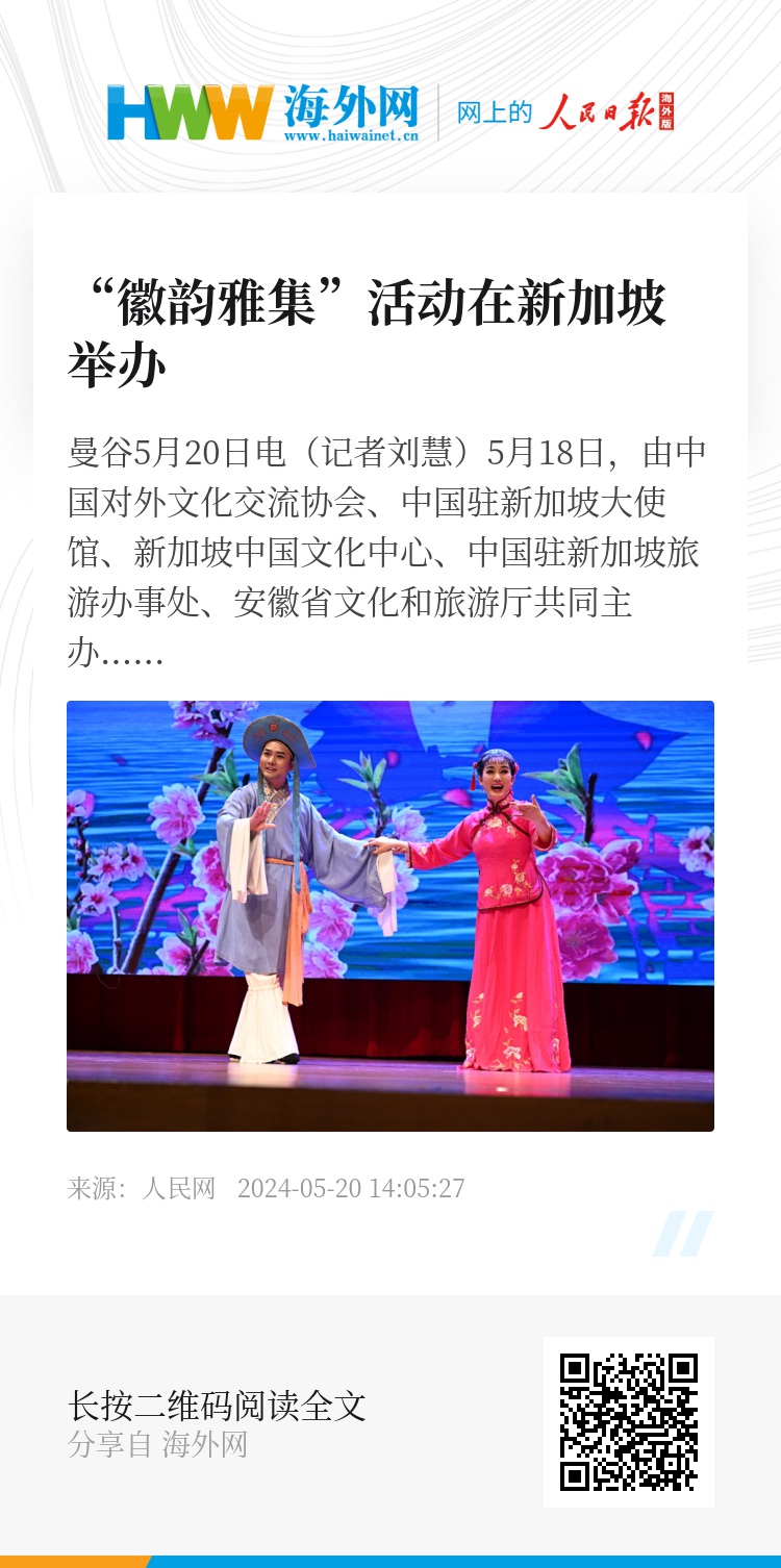 人民网曼谷5月20日电(记者刘慧)5月18日,由中国对外文化交流协会、中国驻新加坡大使馆、新加坡中国文化中心、中国驻新加坡旅游办事处、安徽省文化和旅游厅共同主办的“茶和天下·徽韵雅集”暨安徽文旅推介会活动在新加坡中国文化中心举办。中国驻新加坡大使曹忠明,新加坡中国文化中心兼中国驻新加坡旅游办事处主任肖江华,安徽省文化和旅游厅副厅长王靖等近300名来宾出席。