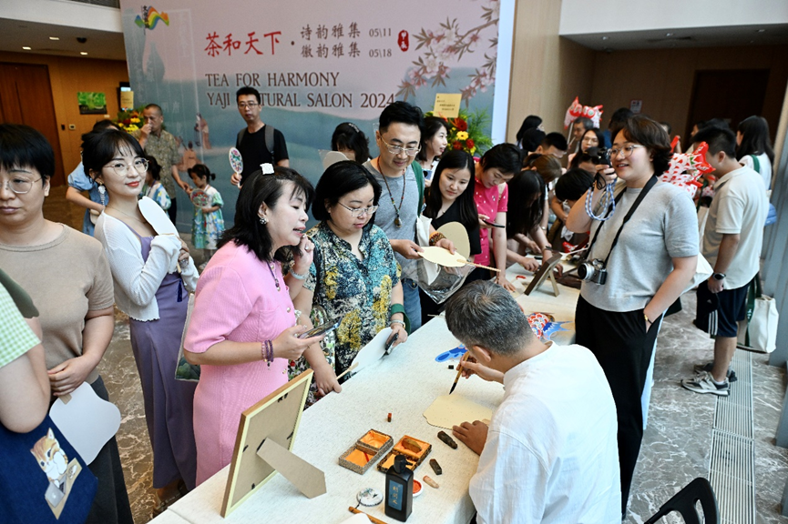 活动现场,观众们不仅欣赏到了书法与茶艺相结合的精彩“品茶挥毫”展示,还沉浸在国家级非物质文化遗产黄梅戏的动人演出中。此外,当天还有徽茶冲泡技艺体验互动、安徽旅游图片展、国潮茶饮品尝以及“茶和天下”文创品展示等活动,深受观众的喜爱。