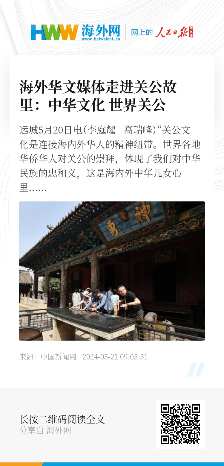 当日,“行走河东·文物保护在运城”海外华文媒体采风行活动在山西运城举行,来自美国、法国、瑞典、意大利、阿根廷等国家和地区的海外华文媒体代表走进“关公故里”。