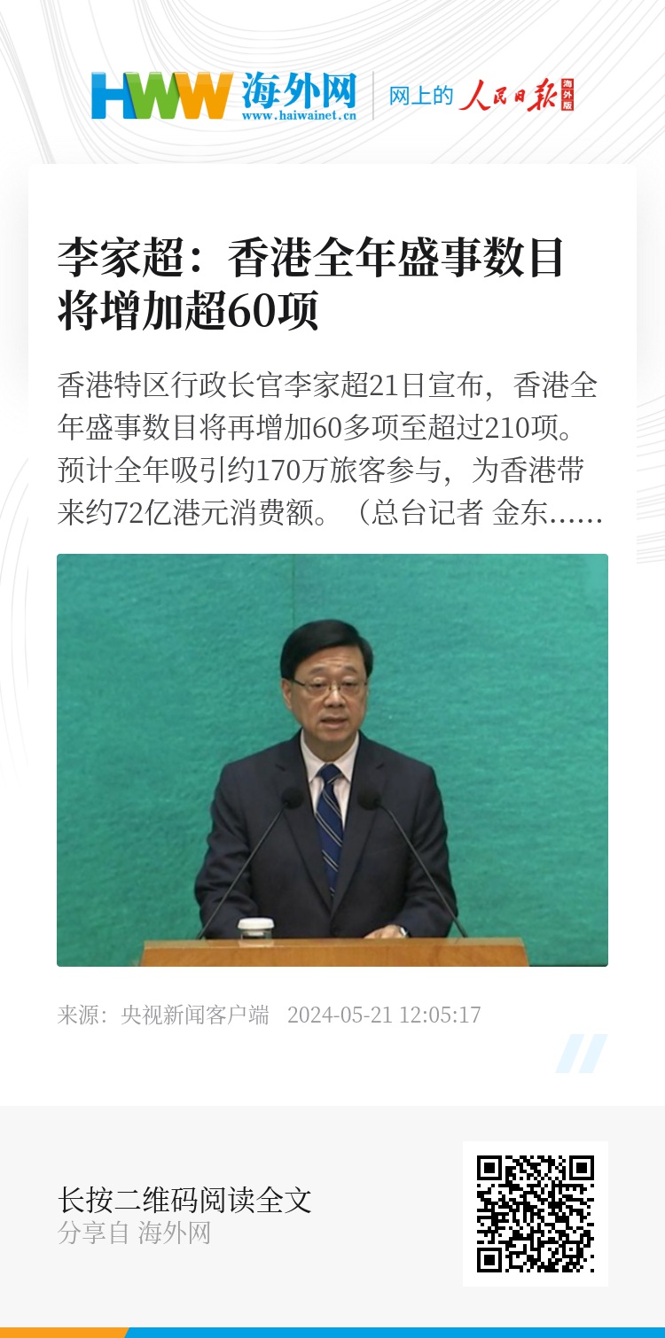 香港特区行政长官李家超21日宣布,香港全年盛事数目将再增加60多项至超过210项。预计全年吸引约170万旅客参与,为香港带来约72亿港元消费额。(总台记者 金东 周伟琪)