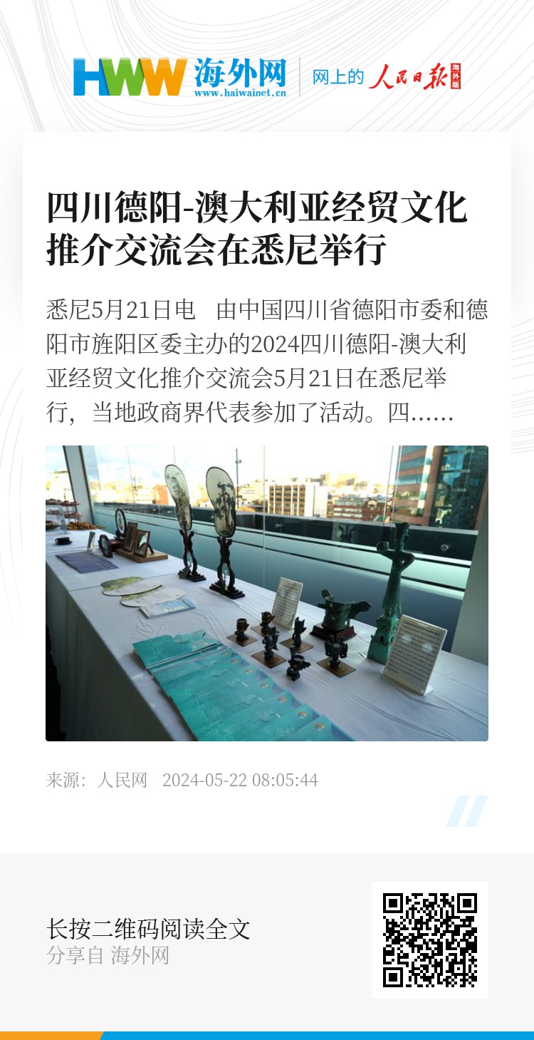 人民网悉尼5月21日电 由中国四川省德阳市委和德阳市旌阳区委主办的2024四川德阳-澳大利亚经贸文化推介交流会5月21日在悉尼举行,当地政商界代表参加了活动。