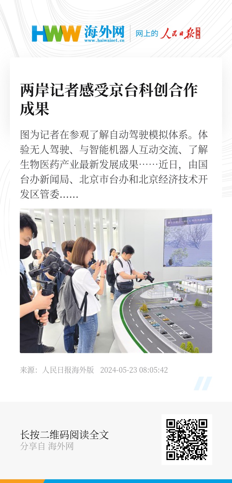 体验无人驾驶、与智能机器人互动交流、了解生物医药产业最新发展成果……近日,由国台办新闻局、北京市台办和北京经济技术开发区管委会共同举办的“感受科技创新 助力融合发展”联合采访活动在京启动。来自海峡两岸的媒体记者一同走进两岸科技创新中心、北京经开区科技企业等参观采访,实地感受两岸科技创新合作成果和北京科技发展动能。