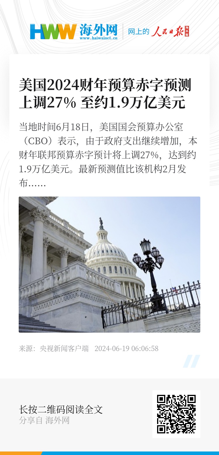 当地时间6月18日,美国国会预算办公室(CBO)表示,由于政府支出继续增加,本财年联邦预算赤字预计将上调27%,达到约1.9万亿美元。最新预测值比该机构2月发布的数值高出约4000亿美元。