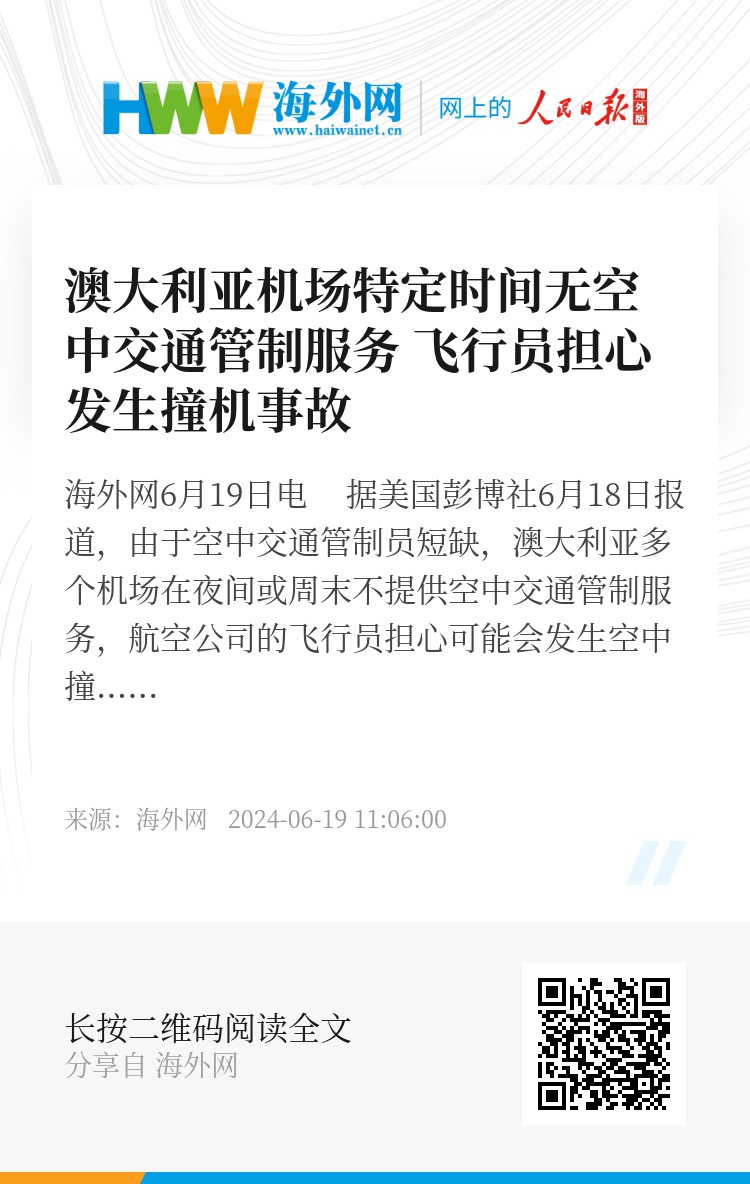 海外网6月19日电 据美国彭博社6月18日报道,由于空中交通管制员短缺,澳大利亚多个机场在夜间或周末不提供空中交通管制服务,航空公司的飞行员担心可能会发生空中撞机事故。