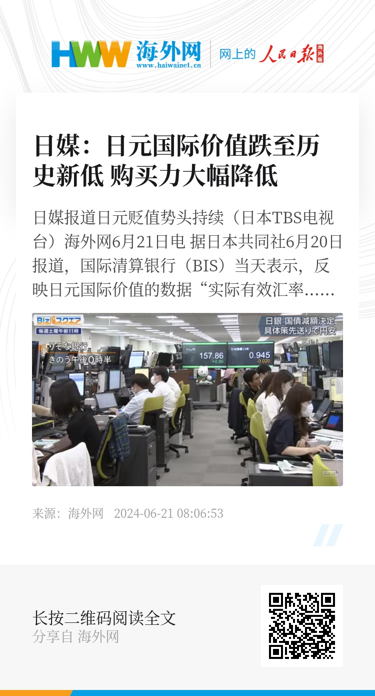 海外网6月21日电 据日本共同社6月20日报道,国际清算银行(BIS)当天表示,反映日元国际价值的数据“实际有效汇率”5月为68.65,跌至历史新低。