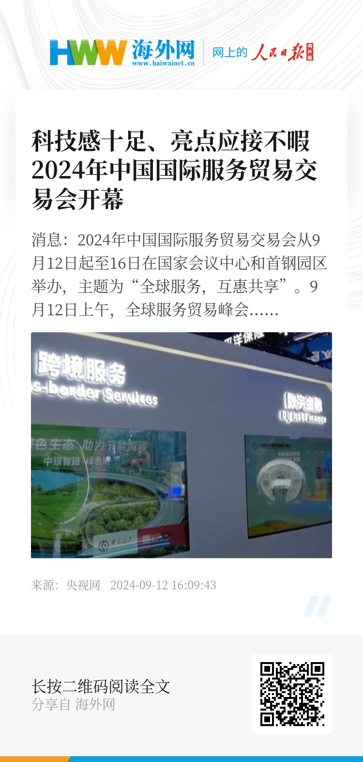 央视网消息:2024年中国国际服务贸易交易会从9月12日起至16日在国家会议中心和首钢园区举办,主题为“全球服务,互惠共享”。9月12日上午,全球服务贸易峰会在北京国家会议中心开幕。在为期五天的活动期间,这里将举办展览展示、洽谈推介、成果发布等配套活动。最新的情况,我们来连线正在中国国家会议中心的总台记者高雪,请她给我们介绍一下了解到的最新情况。