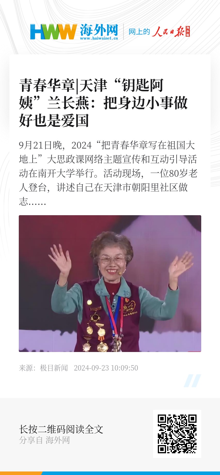 9月21日晚,2024“把青春华章写在祖国大地上”大思政课网络主题宣传和互动引导活动在南开大学举行。活动现场,一位80岁老人登台,讲述自己在天津市朝阳里社区做志愿者24年的经历。她叫兰长燕,但大家更习惯叫她“钥匙阿姨”。
