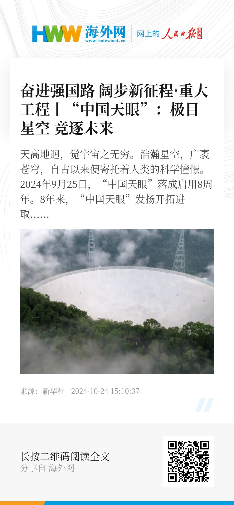 天高地迥,觉宇宙之无穷。浩瀚星空,广袤苍穹,自古以来便寄托着人类的科学憧憬。2024年9月25日,“中国天眼”落成启用8周年。8年来,“中国天眼”发扬开拓进取、勇攀高峰的精神,秉持团结奋进、协同攻关的作风,创新不断,成果频出,不断拓展着人类观天极限,持续为人类极目宇宙贡献中国智慧、提供中国方案。