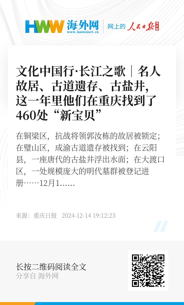 在铜梁区,抗战将领郭汝栋的故居被锁定;在璧山区,成渝古道遗存被找到;在云阳县,一座唐代的古盐井浮出水面;在大渡口区,一处规模庞大的明代墓群被登记进册……