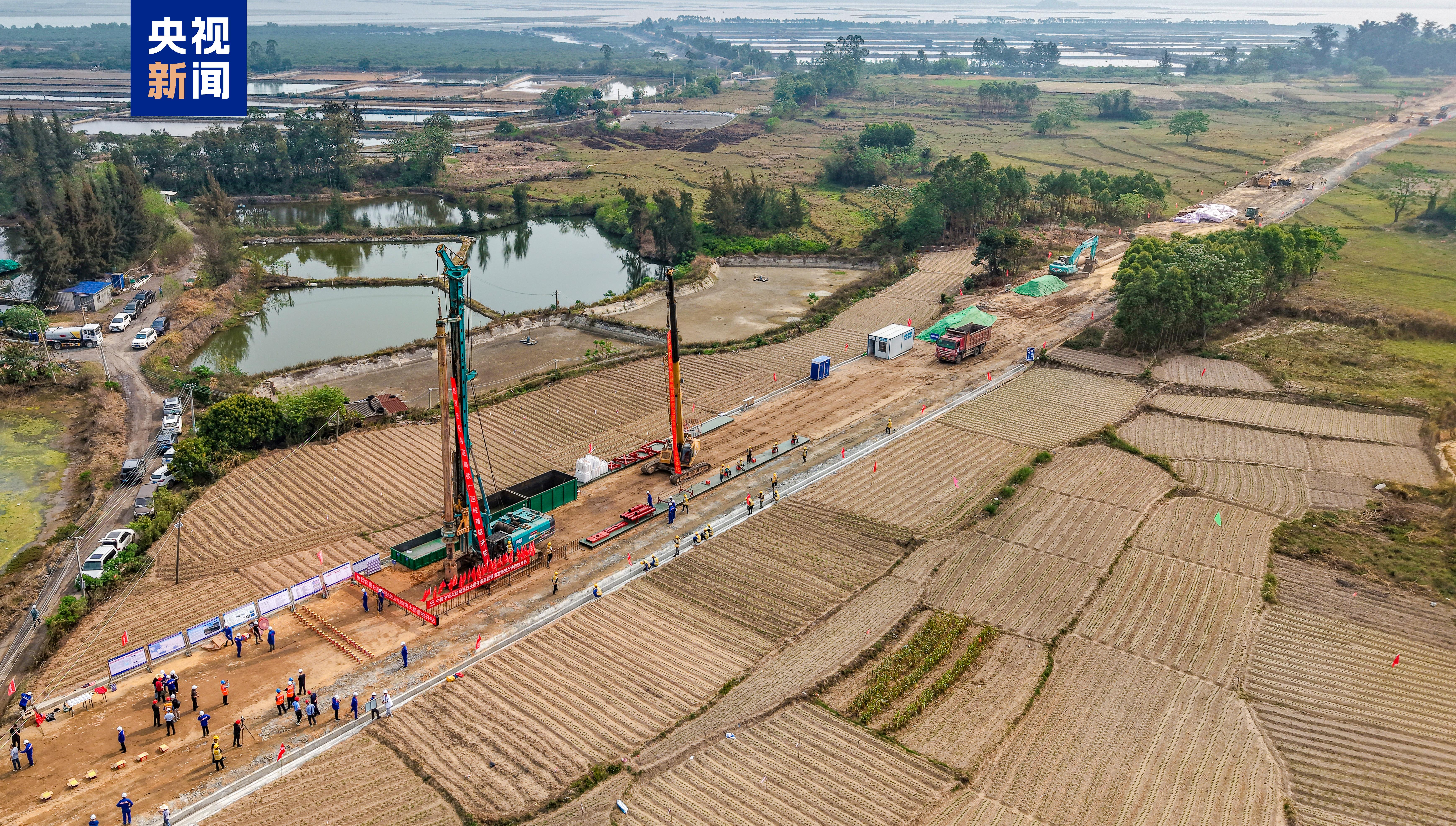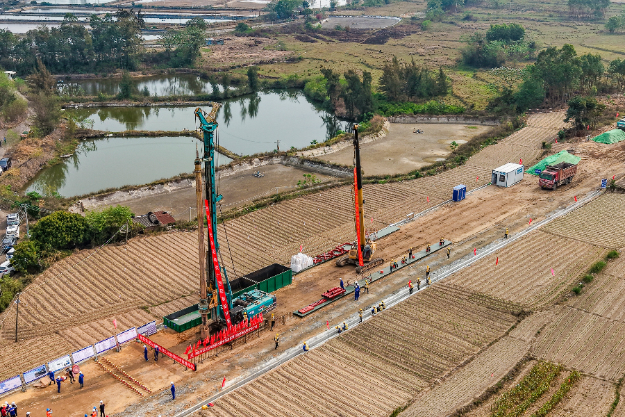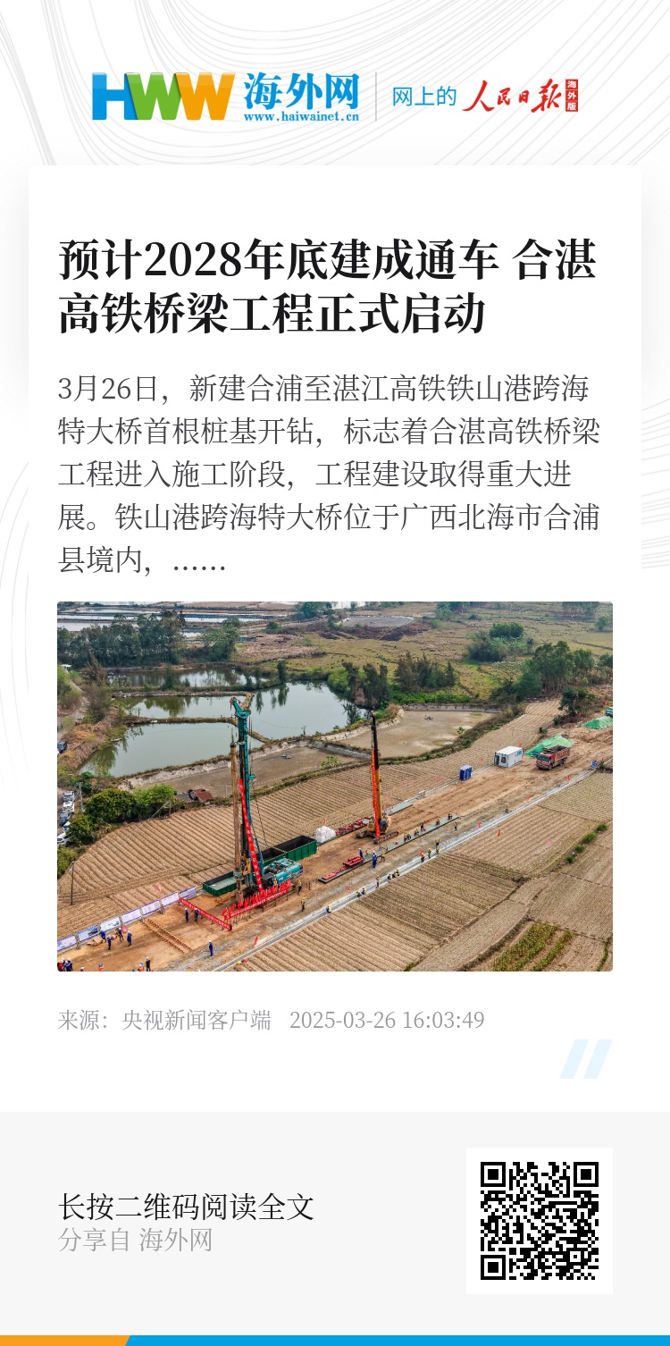 3月26日,新建合浦至湛江高铁铁山港跨海特大桥首根桩基开钻,标志着合湛高铁桥梁工程进入施工阶段,工程建设取得重大进展。铁山港跨海特大桥位于广西北海市合浦县境内,全长8473.478米,是合湛高铁全线控制性工程,也是目前广西最长的跨海铁路桥梁。
