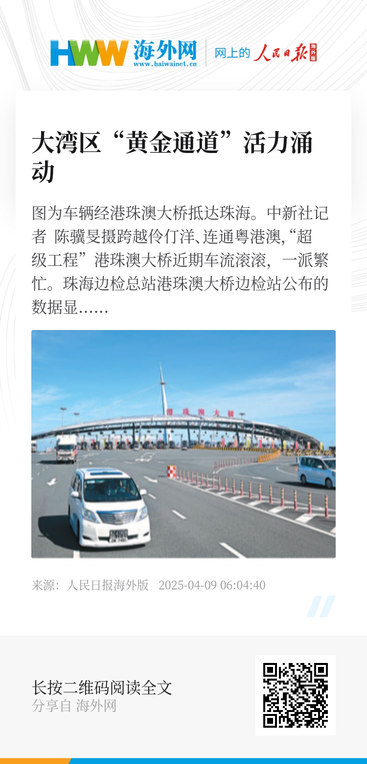 一桥飞架三地,碧海变通途。港珠澳大桥通车以来,已成为粤港澳大湾区互联互通的“黄金通道”,车畅、货兴、人旺,迸发出强劲的经济活力。