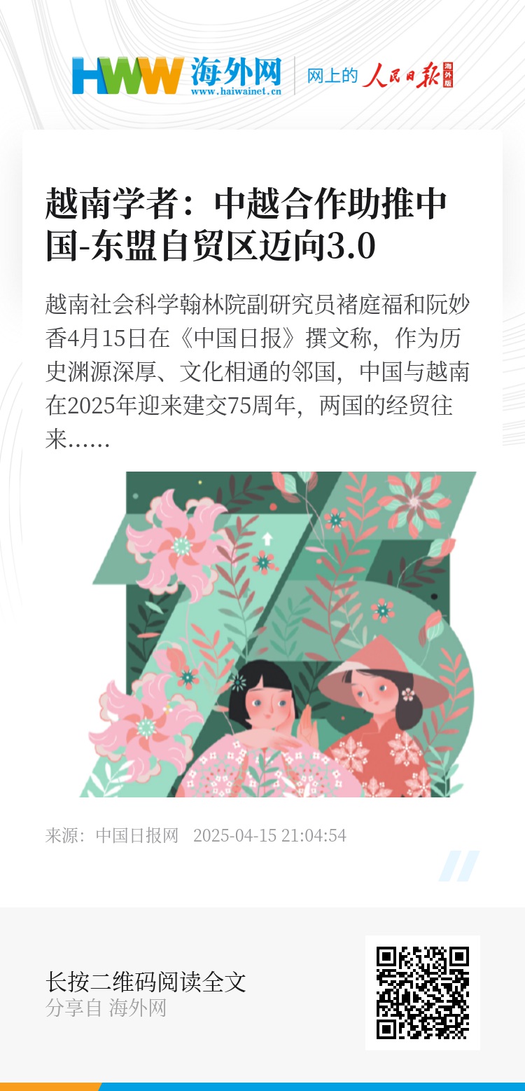 越南社会科学翰林院副研究员褚庭福和阮妙香4月15日在《中国日报》撰文称,作为历史渊源深厚、文化相通的邻国,中国与越南在2025年迎来建交75周年,两国的经贸往来将推动中国-东盟自贸区合作进入3.0时代。