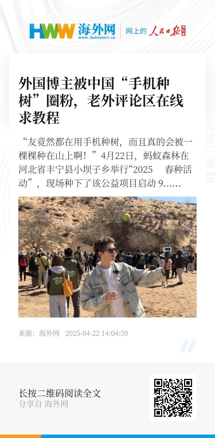 “中国网友竟然都在用手机种树,而且真的会被一棵棵种在山上啊!”4月22日,蚂蚁森林在河北省丰宁县小坝子乡举行“2025 春种活动”,现场种下了该公益项目启动 9 年来的第 6 亿棵树。在活动现场,来自北爱尔兰的亚当兴致勃勃地记录自己成为这六亿分之一的特别体验。